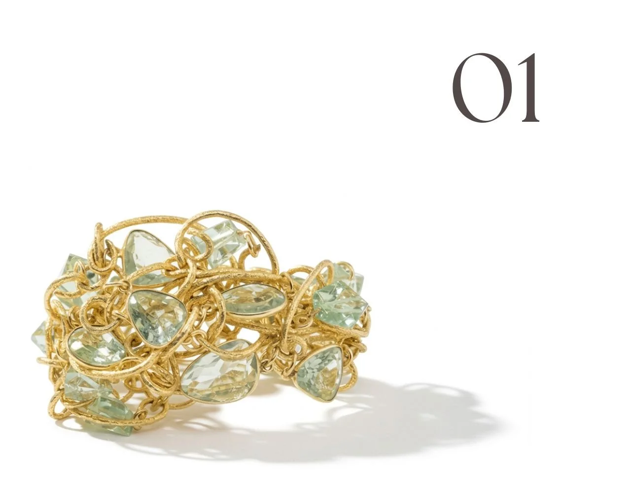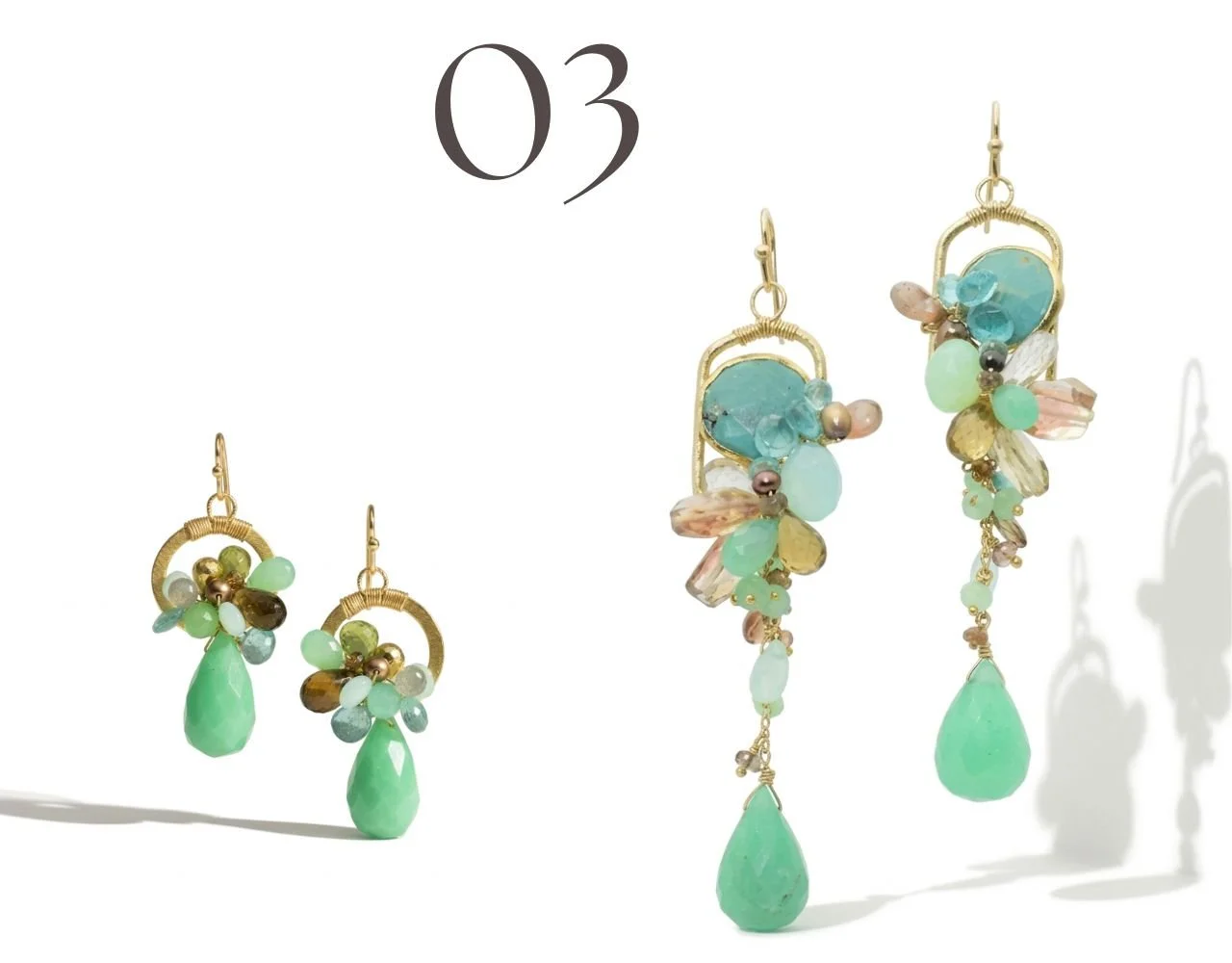 Andrea sources her green chrysoprase at the Tucson Gem Show, selecting stones for vibrant color and unique cuts. The larger stones, chosen specifically for their unusual shapes, become cornerstones of each design. Smaller briolettes are sprinkled into gemstone clusters so the chrysoprase color echoes cohesively throughout every piece.