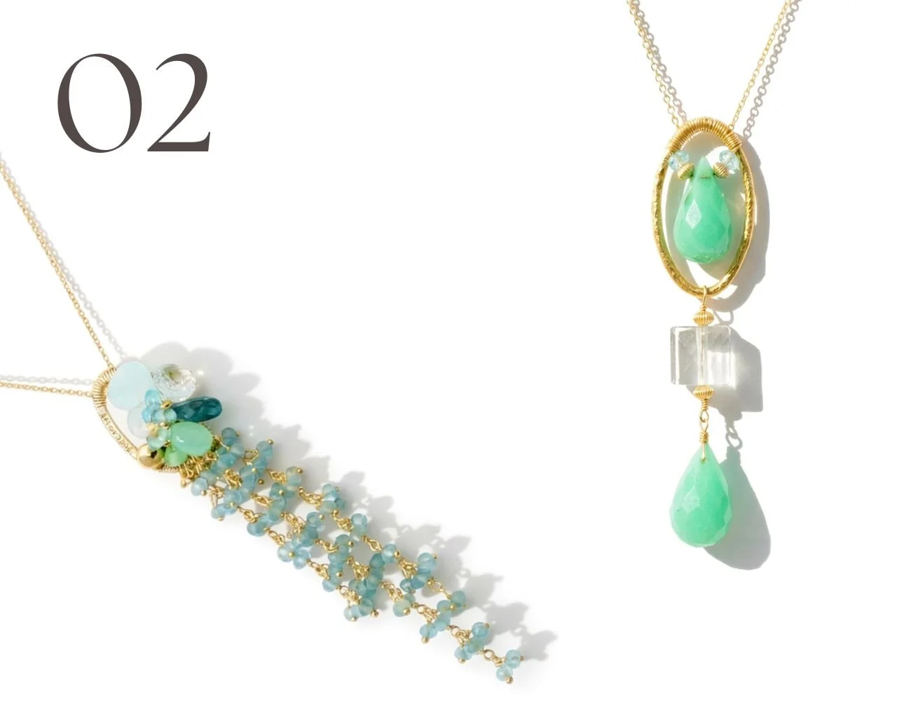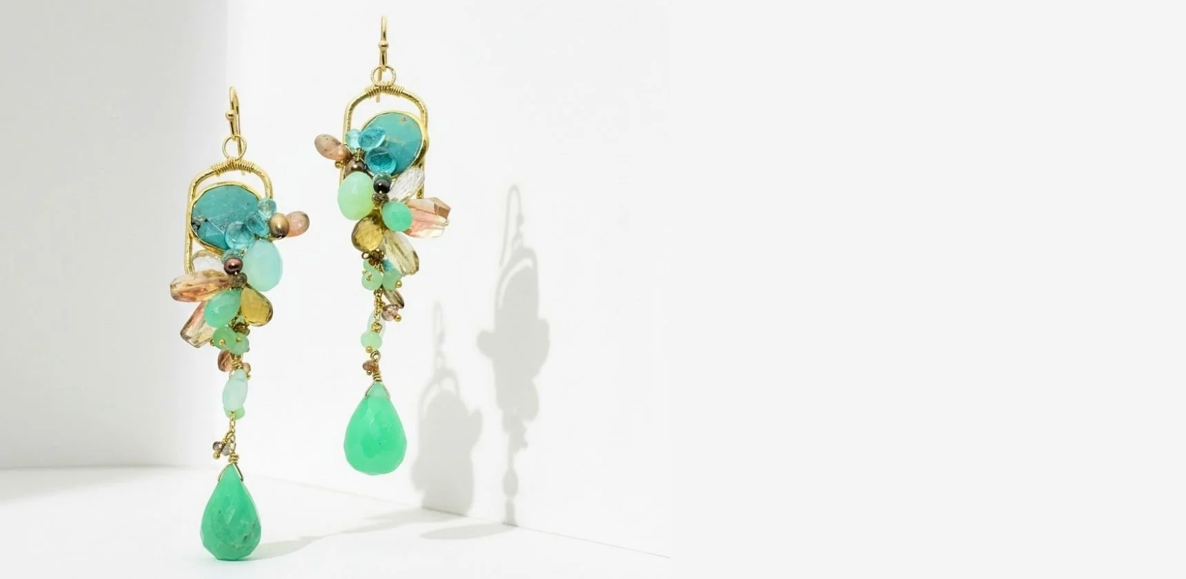 Each piece pairs green chrysoprase cornerstones — selected for their unique, irregular shapes at the Tucson Gem Show — with a carefully curated palette of complementary stones. Andrea uses 14k gold-filled and 24k gold vermeil components, twisting them into unique configurations to add uncommon detailing and architecture to every design. The result is jewelry that feels organic yet intentional, tropical yet sophisticated.