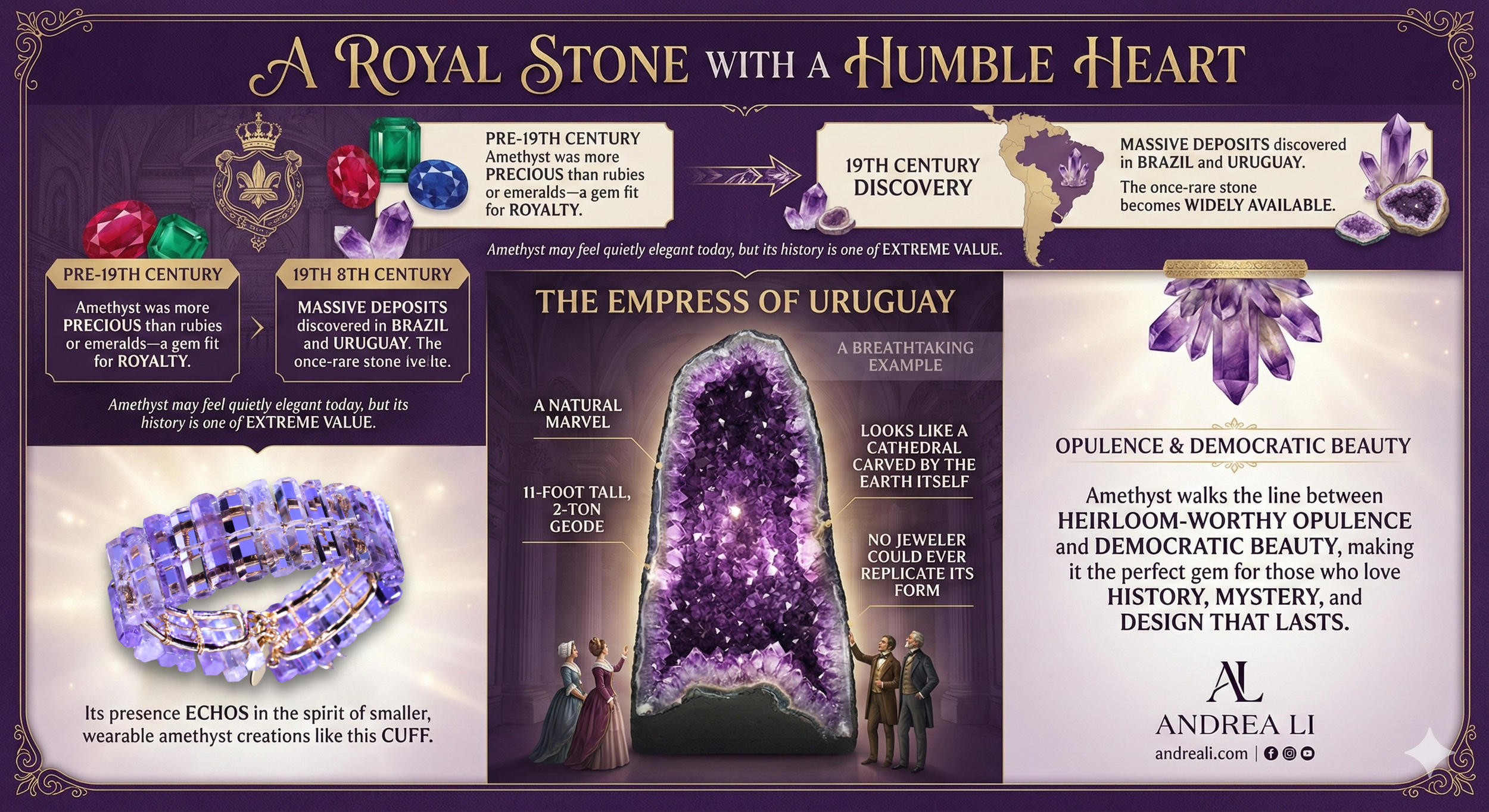 Amethyst walks the line between heirloom-worthy opulence and democratic beauty, making it the perfect gem for those who love history, mystery, and lasting design.