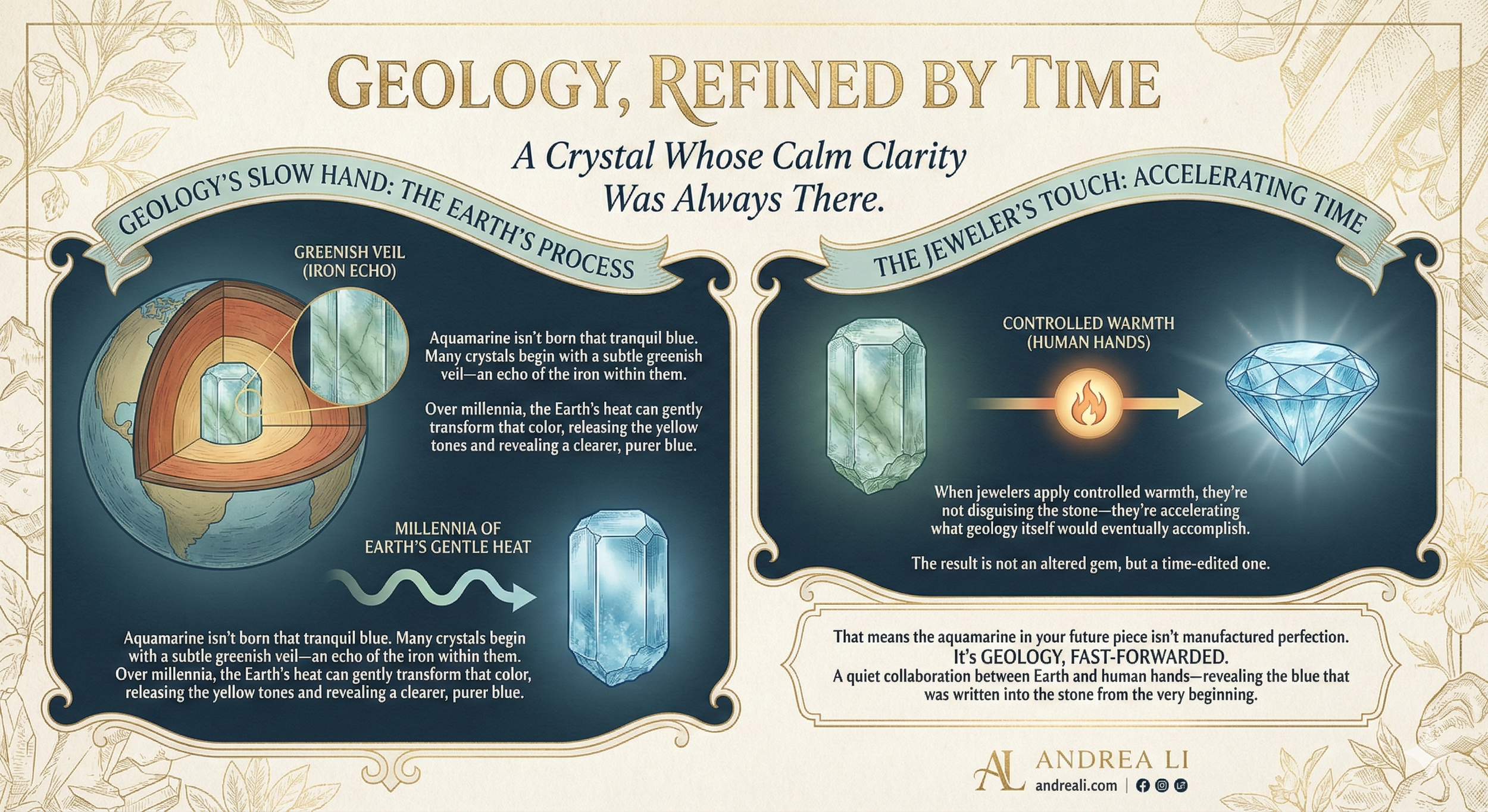 Aquamarine is not born that tranquil blue. Many crystals emerge from the earth with a subtle greenish veil, an echo of the iron impurities within their beryl crystal structure.