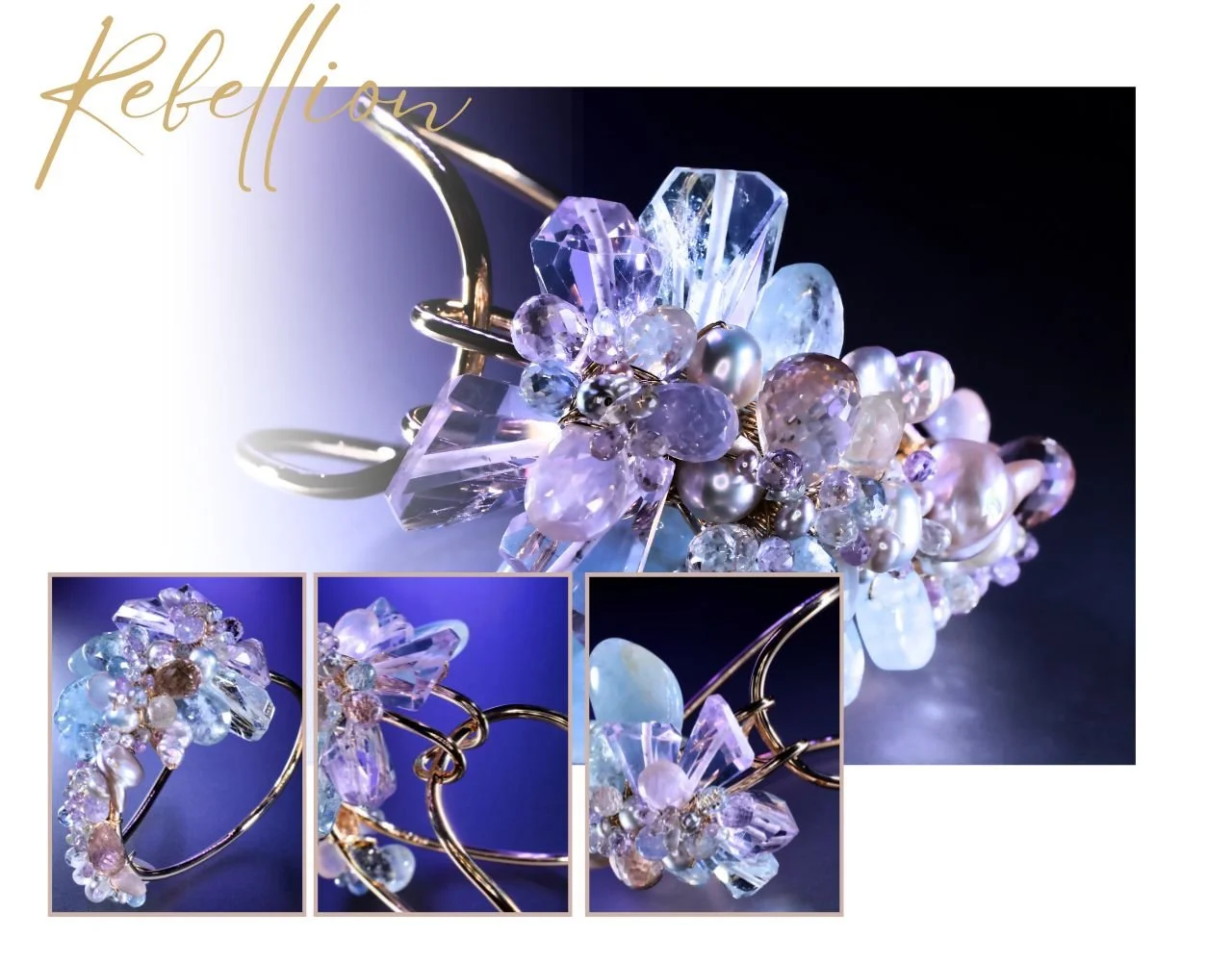 The Pastel Gemstone Statement Cuff is a hand-fabricated, asymmetrical cuff bracelet featuring aquamarine, scapolite, blue topaz, and freshwater pearls set in a gold-filled frame, part of the Tamar Collection by Andrea Li Jewelry. It was not designed to blend in with trend-driven accessories. It was designed to challenge how we assign value to the things we wear.