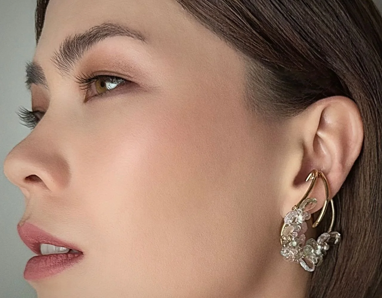 The design fuses Andrea Li's signature gemstone clustering technique with a sculptural, modern form factor that wraps the ear's natural contours. But the final version of these cuffs is not the one originally planned. A measurement error during fabrication forced an improvisation that made the design stronger than the original concept.
