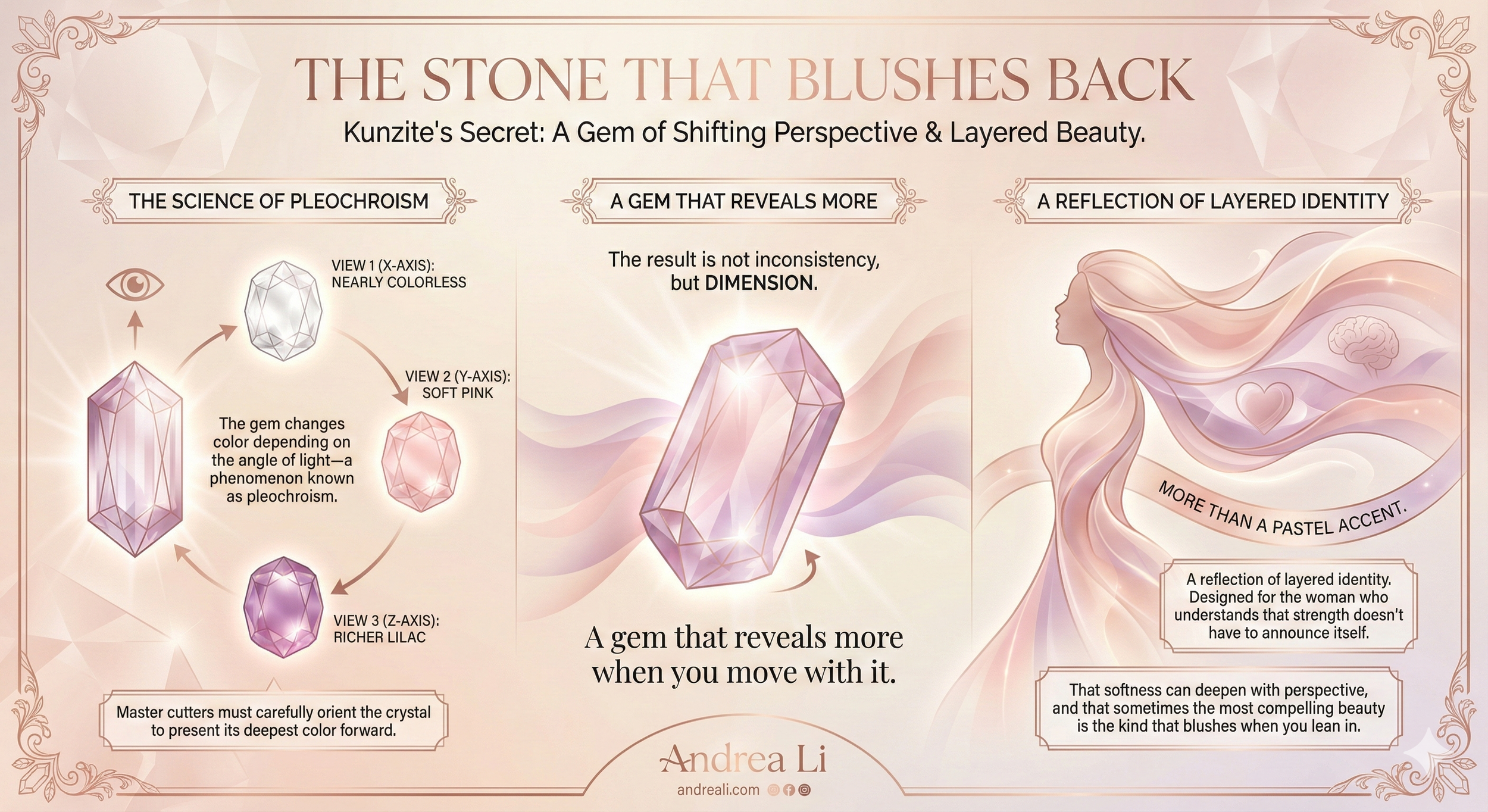 In the Pastel Gemstone Ear Cuffs, the kunzite adds a dimension that static stones cannot — it responds to the wearer's movement, shifting in color as the head turns and light enters from different angles. That responsiveness makes kunzite a natural fit for an ear cuff, where the stone is constantly in motion.
