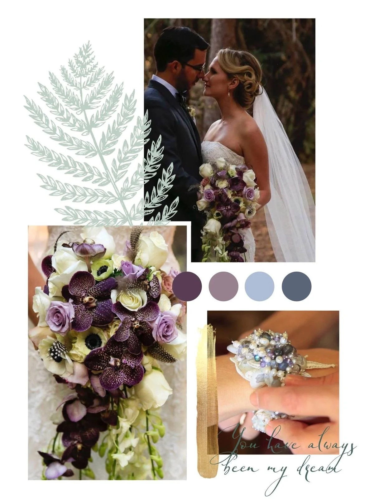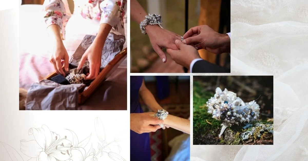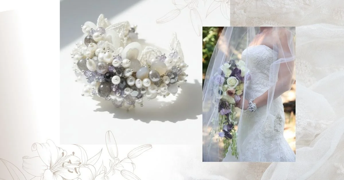The metal was sterling silver, finished with a pearl clasp that echoed the mother's pearls throughout the design. Lace backing, gemstone clustering, inherited pearls, and a color palette that tied it all to the day. Every layer meant something.