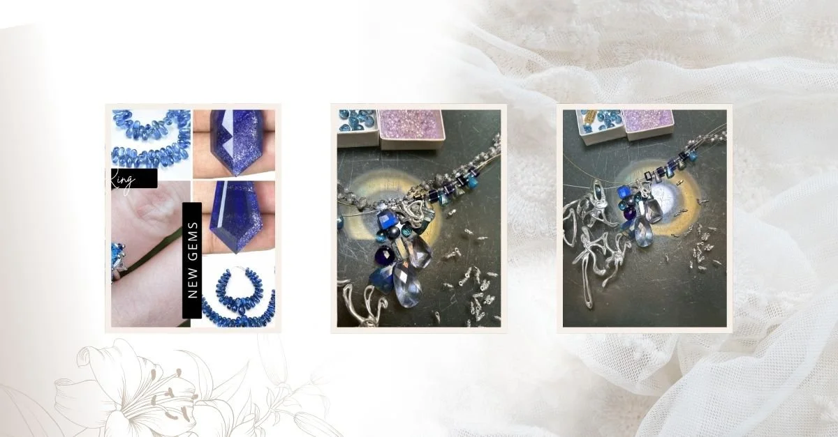 While sourcing for the project, I found black opals. I hadn't planned on them, but the moment I saw how their fire played against the iolite blues, I knew they belonged in this piece. That flash of iridescence added a layer of depth to the color palette that was unexpected and gorgeous.