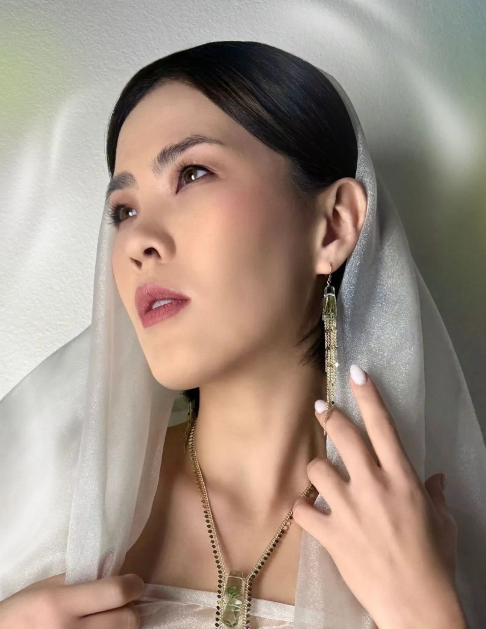 Where the necklace adds structure and presence, the earrings add motion and playfulness. Where the necklace commands the eye downward, the earrings frame the face with light. The two pieces share a color story and material palette, green amethyst and gold-filled metal, but serve different compositional roles within the same look.
