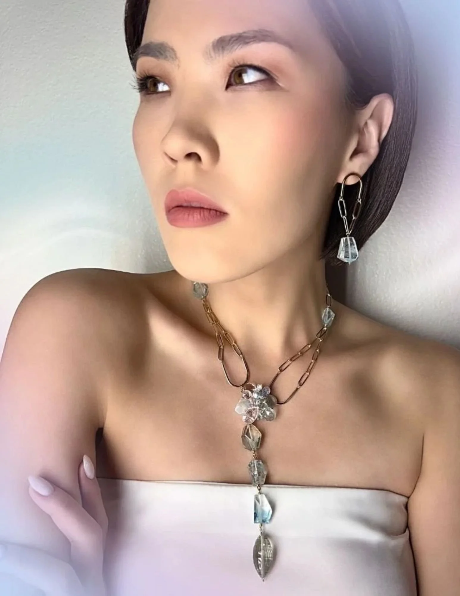 The answer came from a set of blue topaz gemstones Andrea Li sourced at the Tucson Gem Show. They became the bridge, extending the central cluster downward into a dramatic drop that resolves in the AAA concave-cut green amethyst. The concave faceting on that stone catches light in a way that feels almost architectural: controlled, yet luminous. The curved facets, often described as "scallops," distribute light more evenly throughout the gemstone, resulting in a significantly more "sparkly" appearance compared to traditional cuts.