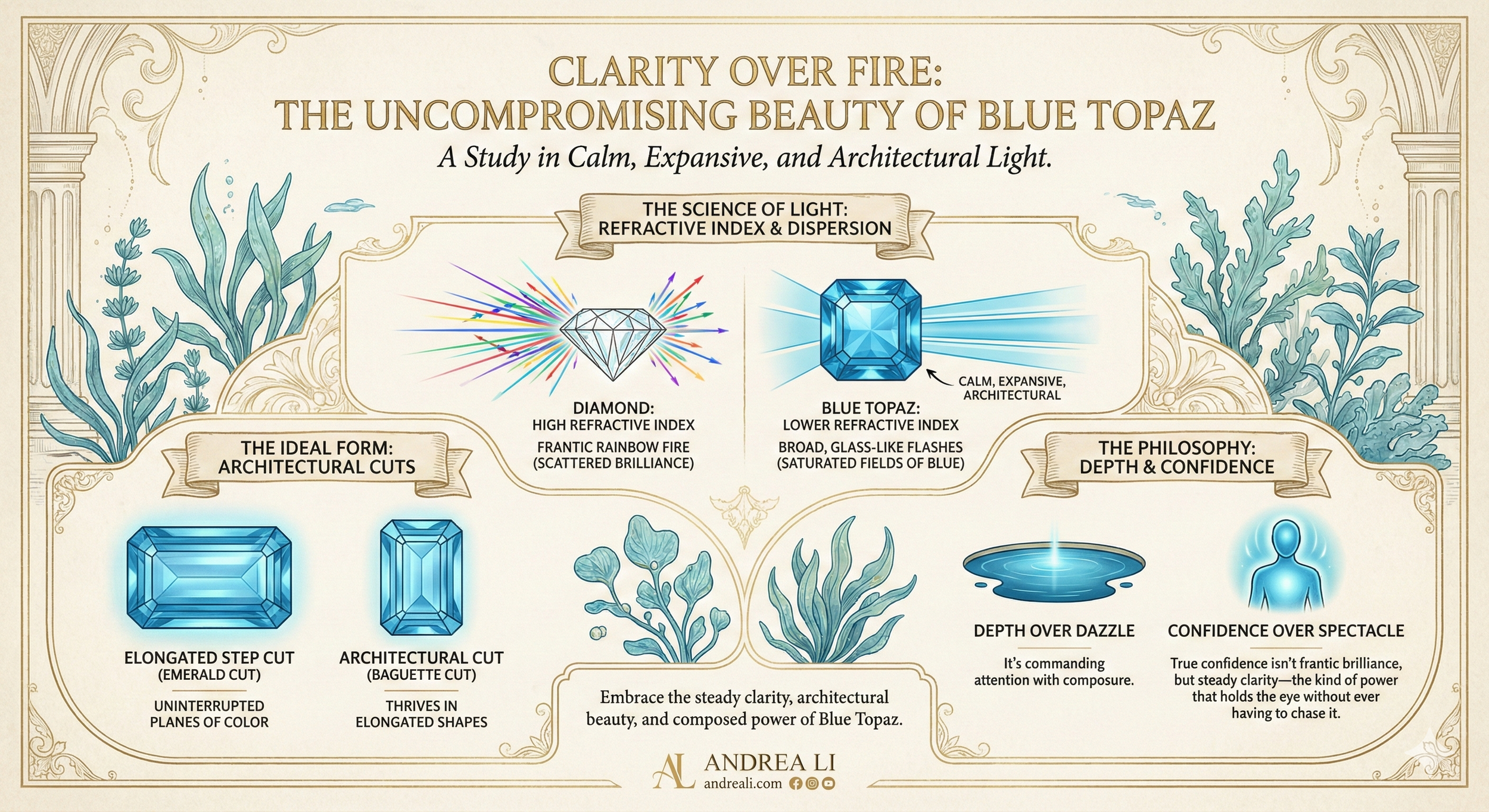 Blue topaz does not sparkle like a diamond, and that is precisely the point. With a naturally clean crystal structure and a lower refractive index than diamond, its beauty is not about frantic rainbow fire. It is about broad, glass-like flashes and saturated blue fields that feel calm, expansive, and architectural.